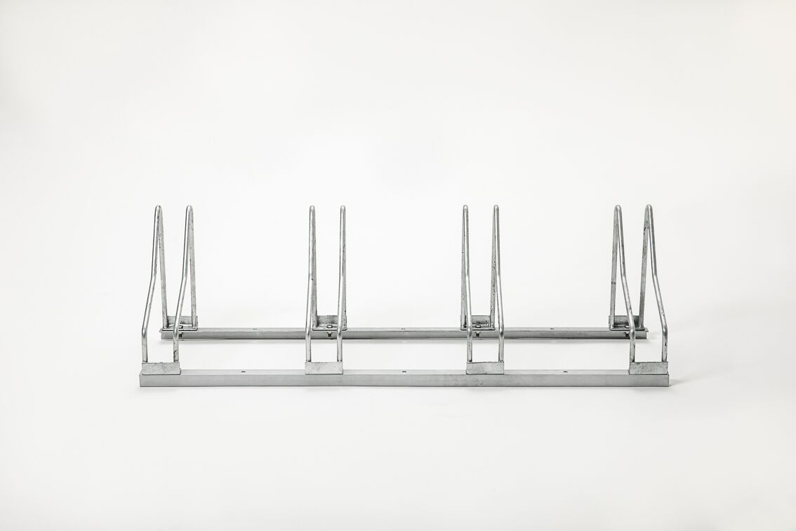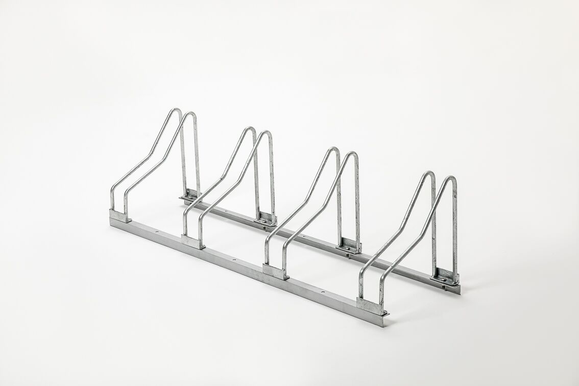 These bicycle racks are 121 cm in length and hold four bicycles. Each stand is spaced 37 cm apart. Holes are provided to enable you to anchor the bicycle racks to the ground if you wish.